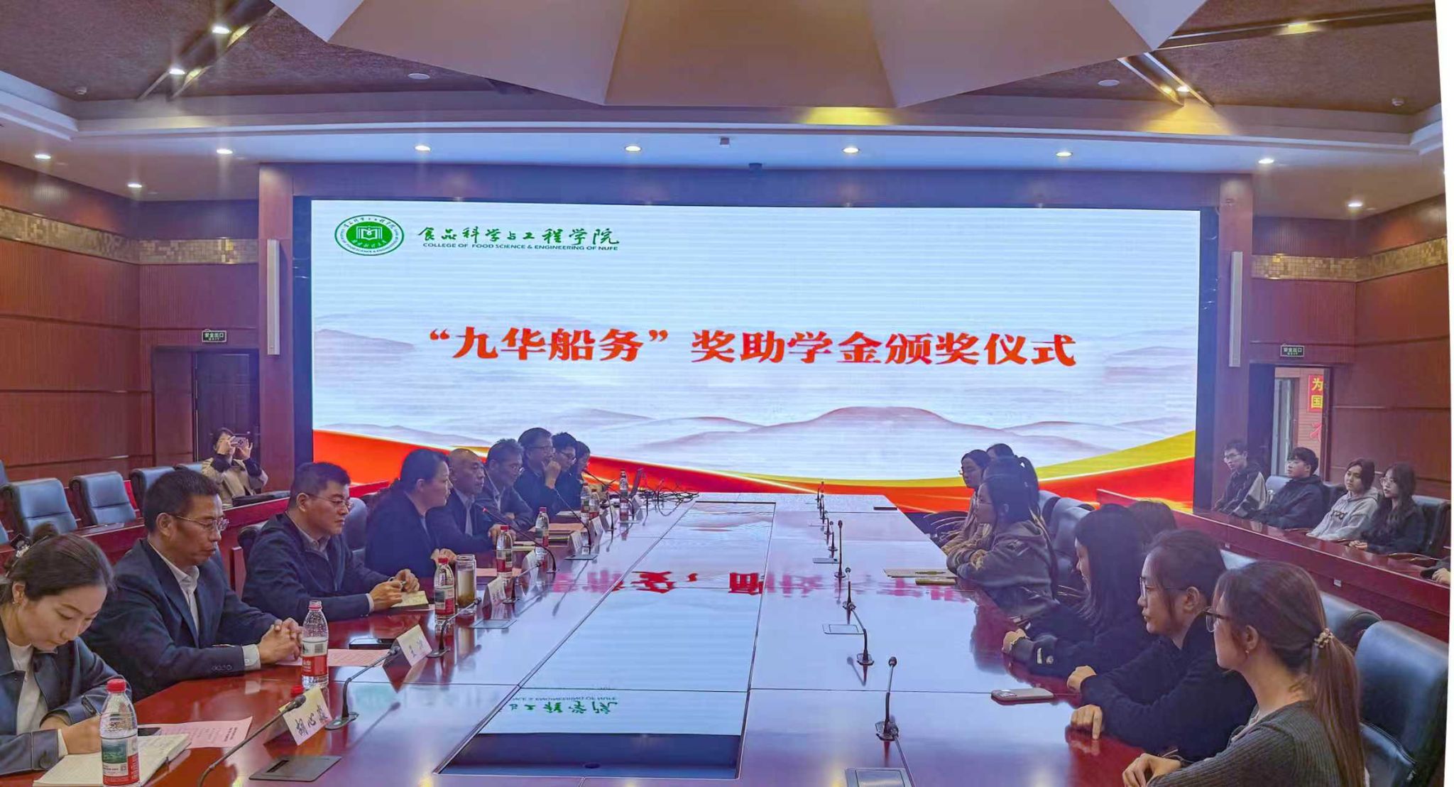 11月14日下午,“九华船务”奖助学金颁奖仪式在仙林校区工科楼二楼会议室举行。党委常委、副校长李煜,食品科学与工程学院校友会会长、安徽池州市九华船务有限公司董事长王国年出席仪式,对外联络处、食品科学与工程学院相关领导和全体获奖获助学生参加仪式。仪式由食品科学与工程学院教育发展基金会秘书长周建新主持。