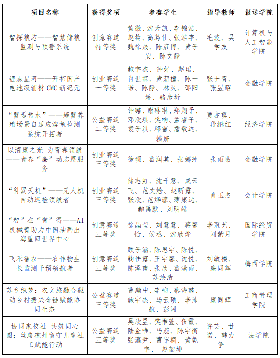 我校计算机与人工智能学院《智探粮芯——智慧储粮监测与预警系统》项目获创意赛道特等奖;金融学院《锂点星河——开拓国产电池级辅材CMC新纪元》项目获创业赛道一等奖;经济学院《“蟹逅智水”——螃蟹养殖场景自适应溶氧检测系统开拓者》项目获公益赛道二等奖;金融学院《以清廉之光 为青春领航——青春“廉”动志愿服务》项目、会计学院《“科巽天机”——无人机自动巡检领航者》项目获创业赛道三等奖;国际经贸学院《“智”在“臂”得——AI机械臂助力中国油画出海重回世界中心》项目、梅西学院《飞禾智农——农作物生长检测干预领航者》项目获创意赛道三等奖;工商管理学院《苏乡织梦:农文旅融合驱动乡村振兴全链赋能协同生态》项目、法学院《协同家校社 共筑同心圆:丝路凉州留守儿童社工赋能行动》项目获公益赛道三等奖。