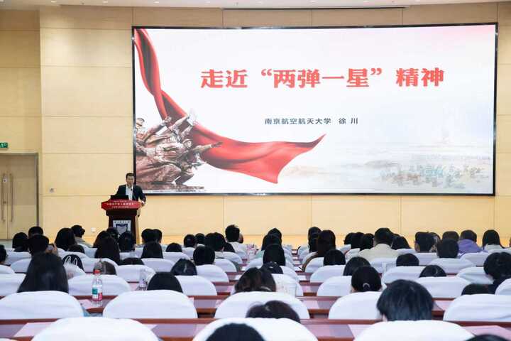 “科学没有国界,可是,科学家有祖国。”南京航空航天大学党委常委、宣传部部长徐川通过讲述钱学森、邓稼先、程开甲、彭桓武、郭永怀等一批科学家先辈们当年的故事,娓娓道来“两弹一星”精神内涵:“热爱祖国、无私奉献,自力更生、艰苦奋斗,大力协同、勇于登攀”。他寄语同学们:“对历史最好的纪念是创造全新的历史,对精神最好的传承是弘扬伟大的精神。”