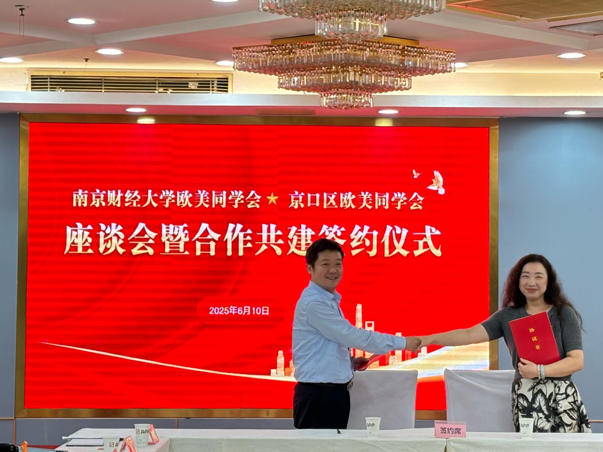 下午,我校欧美同学会与京口区欧美同学会开展座谈交流。双方围绕校地统战平台共建、新形势下欧美同学会组织建设、归国留学人员创新创业等方面展开深入交流,并签署了共建合作协议。签约仪式后,双方欧美同学会会长作表态发言,表示希望通过此次合作共建,进一步增进了解、加强合作,在人才培养、科技创新、社会服务等领域实现优势互补、资源共享,共同推进双方留学人员的事业发展。陈静部长表示,希望双方依托各自优势,共同推动产学研合作和人才交流,共筑产教融合平台,打造创新发展共同体;共育创新科技人才,激发高质量发展原动力;共创同心实践品牌,打造区域发展新引擎。李玉琴部长表示,希望加强双方统战部门的合作交流,持续提升校地统战融合矩阵效应,真正形成全方位、深层次、宽领域、高水平的合作新格局,切实把合作优势转化为推动服务地方高质量发展的实际成效。